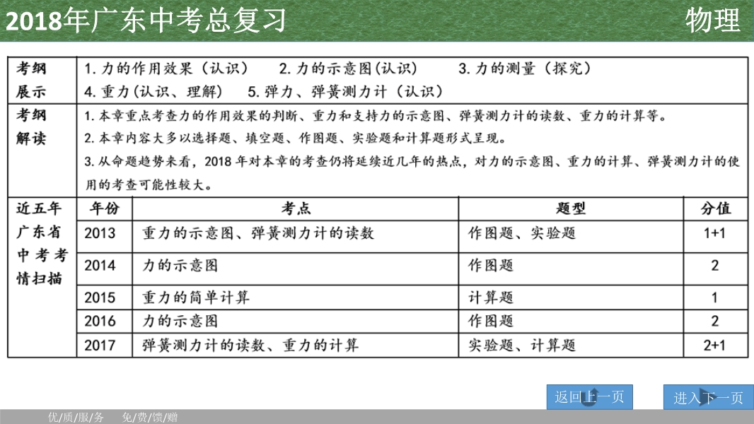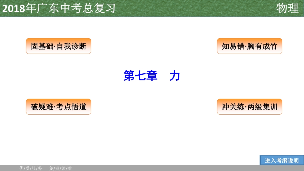 【内容简介】广东省佛山市2018中考物理复习课件:《第七章 力》PPT课件,课件有43幻灯片,课件首先展示了考纲和考点,展示了近几年来命题,然后分成四个部分:固基础·自我诊断,知易错·胸有成竹;破疑难·考点悟道;冲关练·两级集训。课件制作精美。