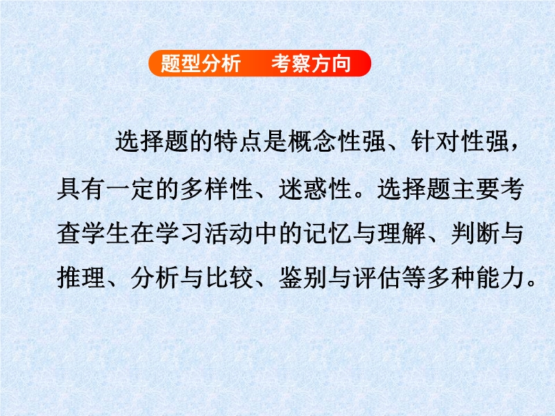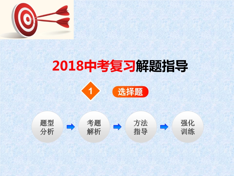 【内容简介】2018中考复习解题指导《选择题》PPT,课件48张。课件有四个方便;题型分析、考题解析、方法指导、强化训练.