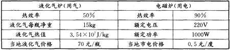 (提示:液化气炉热效率是指炉子有效利用的热量与燃料完全燃烧放出的热量之比;电磁炉热效率是指电磁炉有效利用的热量与消耗的电能之比)