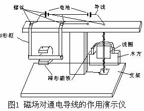 初中物理新课标八年级下册“电动机”一节中,“磁场对通电导线的作用”教材安排了两个演示实验:通电导线在磁场中受到力和通电线圈在磁场中扭转。其中前者按照教材的方法演示,可见度小;后者由于线圈导线和支架相接触摩擦阻力较大,演示效果不明显。为此本人把这两个实验做了改进,并做在一个支架上(如图1),通过改进后增加了可见度,演示效果也极为明显。